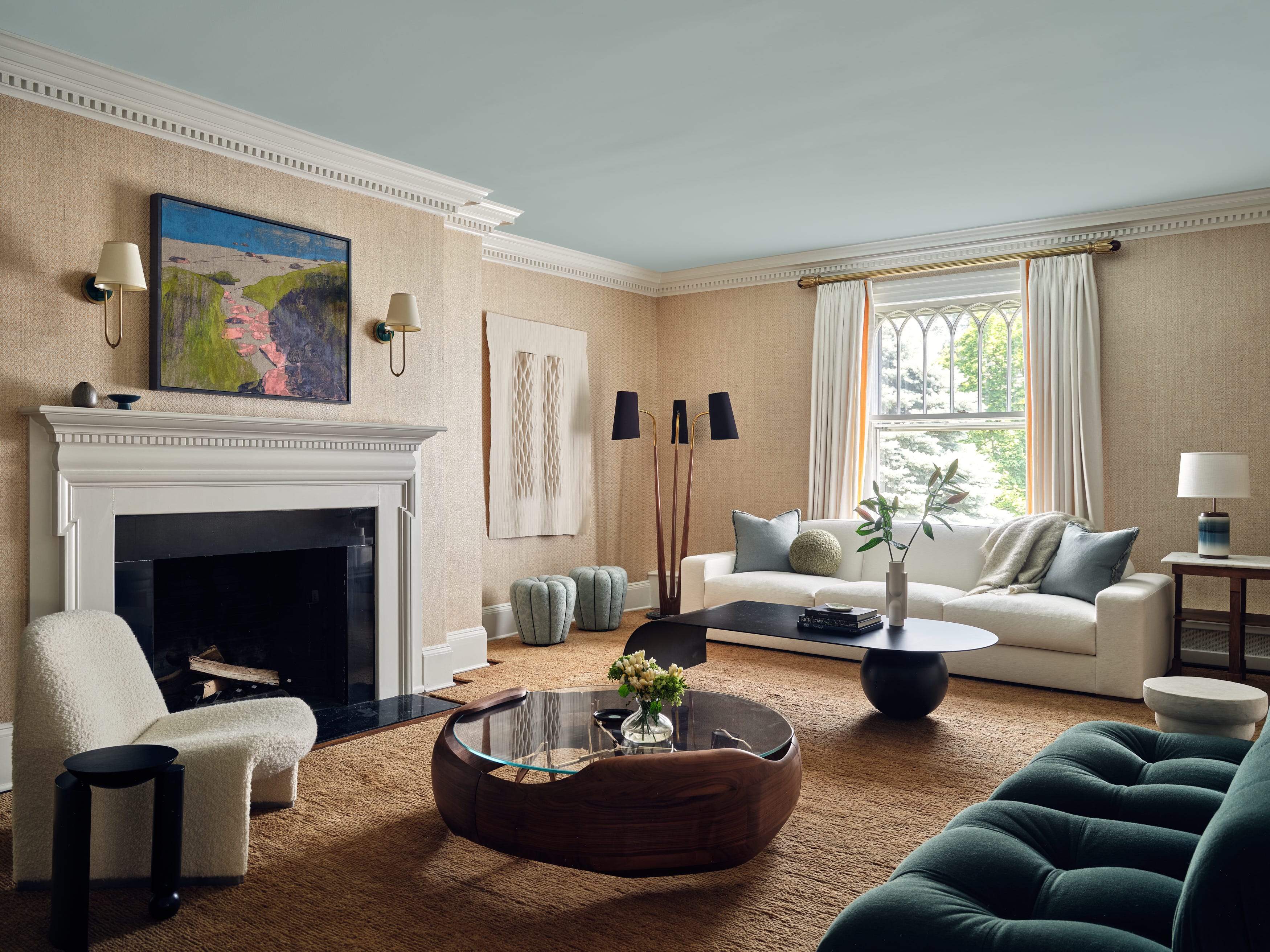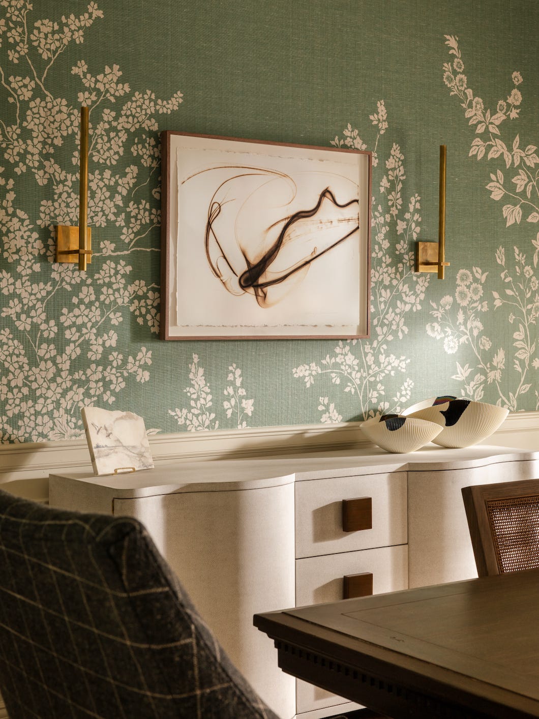 We have one client who has always said she doesn’t want too many stars in a room, and we agree. There’s a beauty to balance - higher energy pieces with quieter ones; textural paintings with subtle works on paper, and dense compositions with more minimalistic ones. See the below image of an Etsuko Ichikawa “pyrograph” (made by a burning tool) layered onto a floral wallpaper in this Jenny Madden-designed home. The art and wallpaper together elevate each individually, creating overall balance, depth, and visual interest.