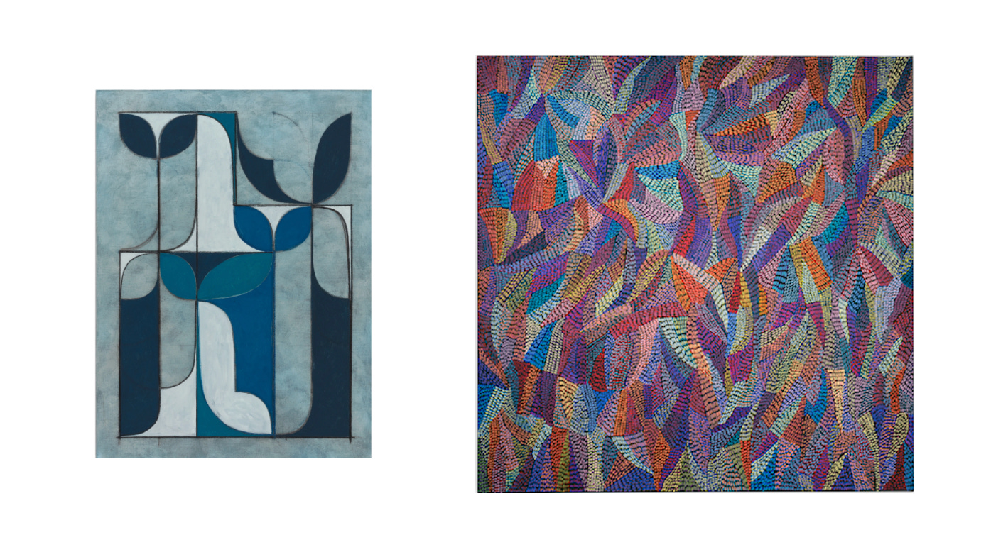 Having one piece unexpectedly share a form with the other creates a relationship between the works that feels unexpected and engaging. These types of relationships can be discovered when you think about pairings. Here’s one we’re considering for a Greenwich, Connecticut client. After playing with digital images of various favored options, we loved the repeated petal form in the two works shown here by Kamrooz Aram and Madeleine Keesing.